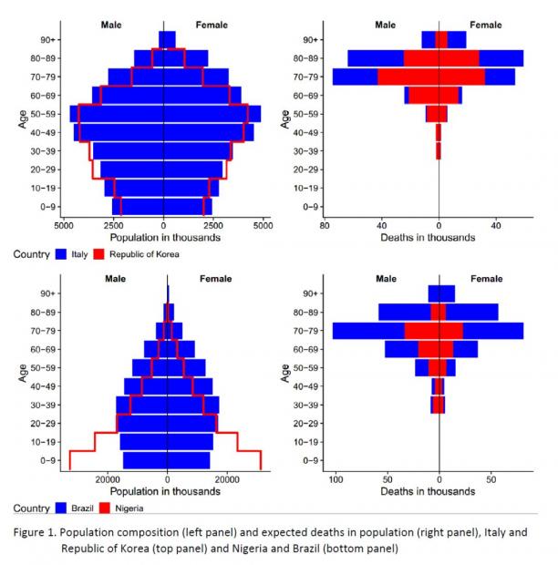 这两个国家有着近似的人口数和不同的年龄结构,左下角的金字塔显示了两个国家的人口年龄结构,蓝色表示巴西,红色表示尼日利亚,巴西的人口结构要更为老化。在这样的情形下,巴西的预计死亡人数也要远大于尼日利亚(右下角的金字塔)。
