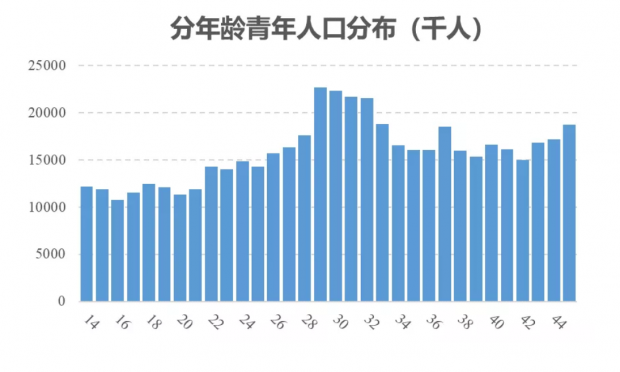 如果依据最宽泛的年龄定义,青年是14岁-45岁之间的人口,大约有5亿的中国人可以在今天庆祝青年节。人数最多的是29-32岁年龄段。
