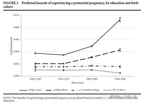 两位作者从对出生世代和受教育程度的交互项的分析中发现了相似的结论(见下图)。在1960年代和1970年代出生的女性中,未婚先孕的风险随着受教育程度增加而降低,但差异较小,从下图可以看出其折线变化较平。而在1980年代和1990年代出生的女性中,同样的趋势在受教育程度不同的群体之间变化的差异则大大增加了,其折线变化较陡。由此可见,随着出生世代的变迁,受教育程度低的女性与受教育程度高的女性经历未婚先孕的差异越来越大。换句话来说,未婚先孕率越来越高这一现象主要是由于受教育程度较低(低于高中学历)的女性中未婚先孕率的增加。