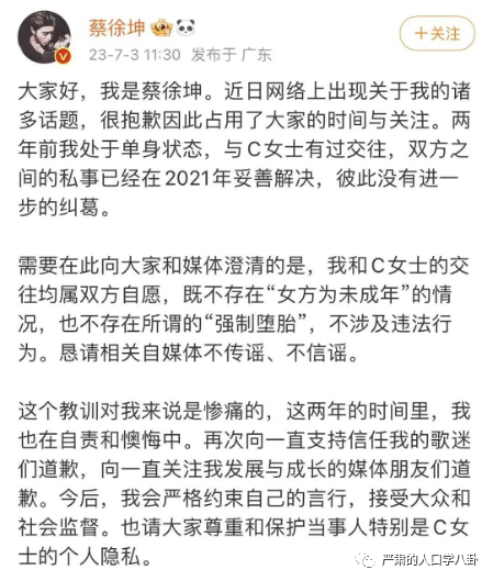 众所周知,夏天的瓜又大又甜。七月才刚开始,先有黄子佼爆出一连串台娱陈年老瓜,后有蔡徐坤平地惊雷送上大瓜。在沉默了一周之后,经历了全网热搜、奔跑吧停播、豆瓣清空、央视频下架、代言公司股价暴跌的蔡徐坤终于做出了回应,间接承认了与C女士“短暂交往”后发现对方怀孕并已在双方协商后由C 女士自愿堕胎: