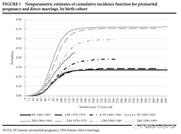 未婚先孕的现象之所以在先前的研究中较少被关注到,其中一个原因是因为中国的许多生育调查仅局限于有过婚史的女性,没有收集未婚女性的生育数据(Li and Newcomer 1996)。本文介绍的这篇研究使用的是2017年全国生育状况抽样调查,这个调查提供了关于不同婚姻情况下的女性的生育意愿和生育行为的高质量数据。本研究共包括了221990个女性,其中因变量分为先婚后孕(参照组)、未婚先孕、未婚未孕三种类型,可能随着时间变化而改变,自变量包括女性的出生世代和受教育程度。世代的测量间隔是十年,即受访者分为60后、70后、80后、90后四个世代。受教育程度分为高中以下、高中文凭、大专、本科学历及以上四类。