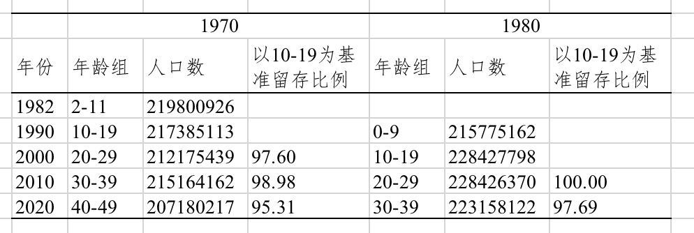 一个方案是人口存活比例,可以直接利用每次普查公布的分年龄的人口数来计算。比如80后在30-39岁的存活比例,可以通过1990年普查0-9岁的总人口数/2020年普查30-39岁的总人口数来获得。需要指出的是,这里计算的是存活比例,用1-这个数字并不等于死亡率,而是死亡比例。要转换成死亡率需要很复杂的过程和额外信息,因此文章中提到的80后的死亡率是5.2%,显然是一个错误的概念。